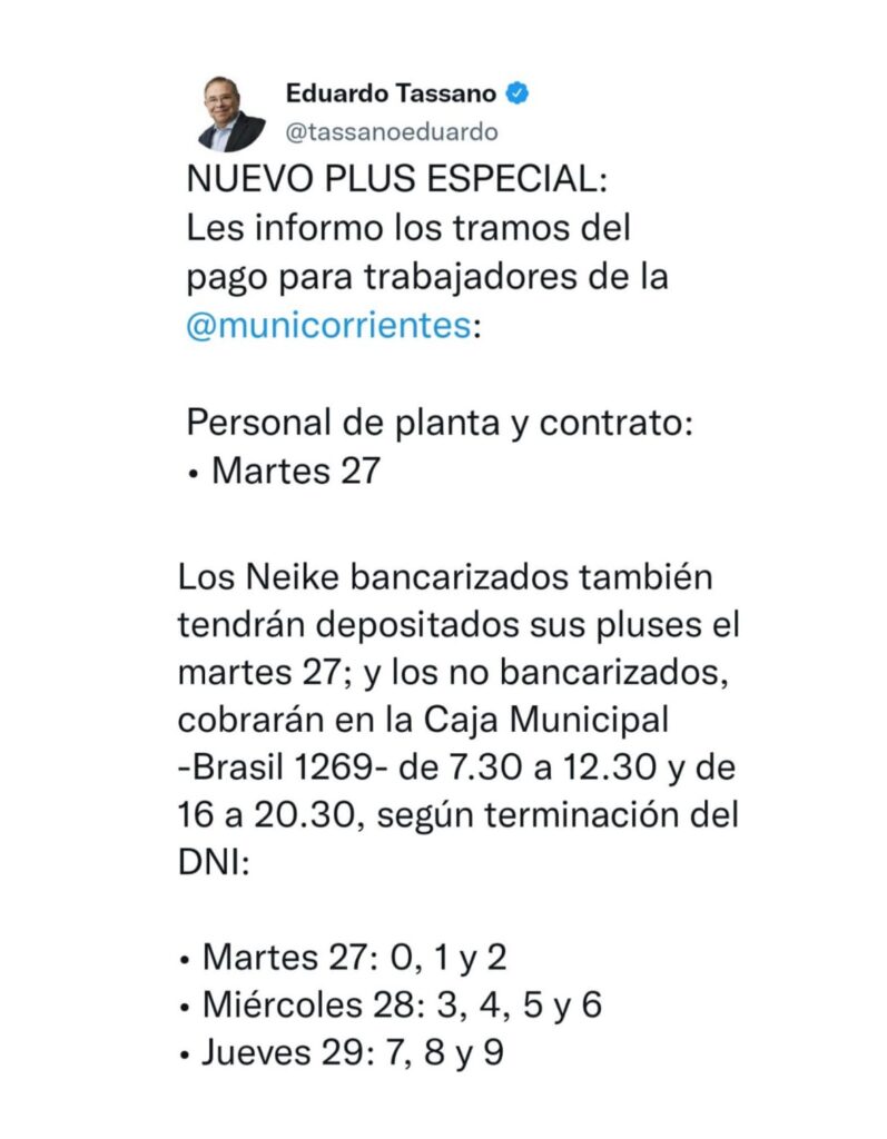 Este martes 27, la Municipalidad de Corrientes iniciará el pago del nuevo plus especial para todo el personal, según informó el intendente Eduardo Tassano.